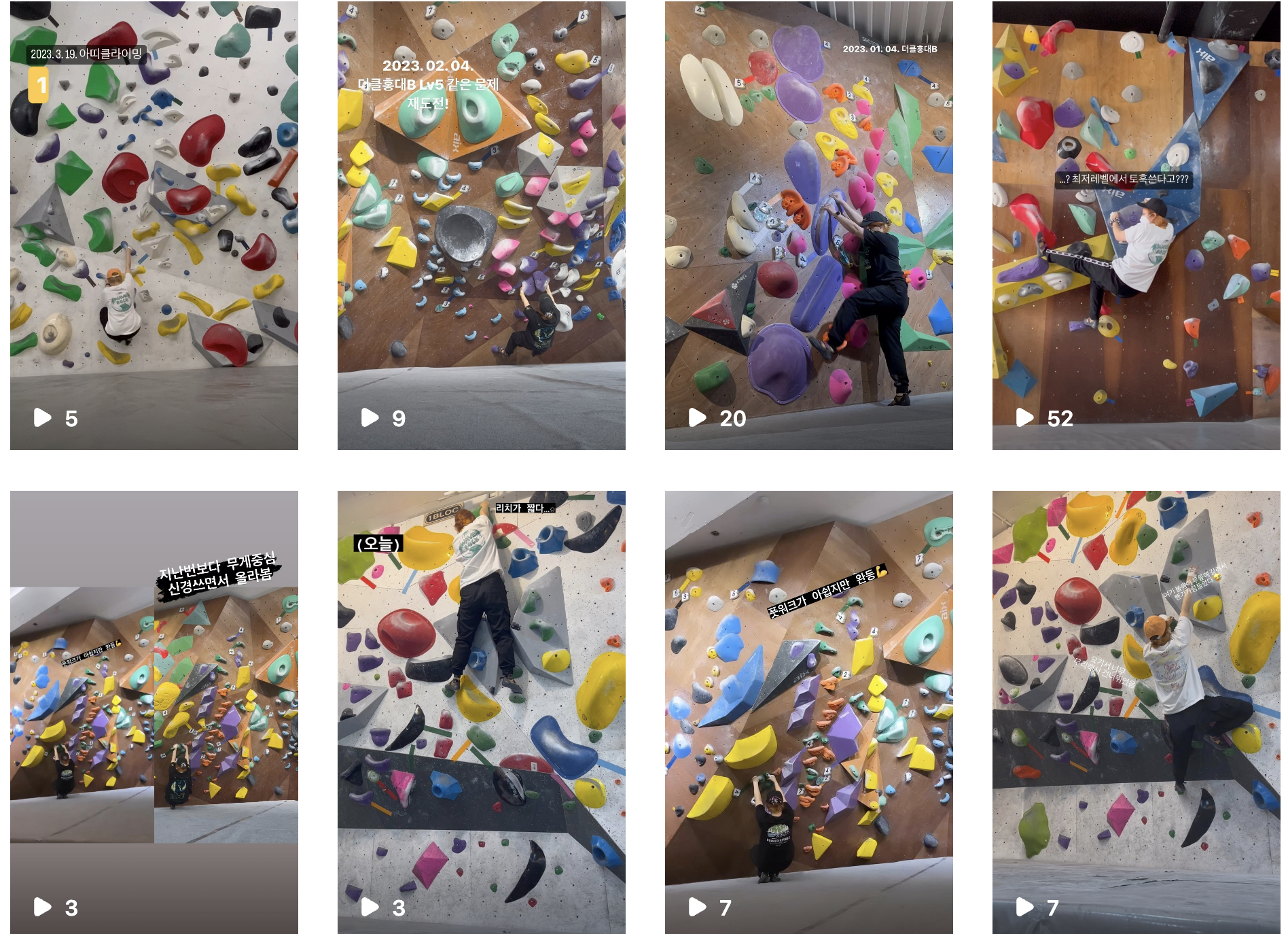 도전 계기클라이밍이 올림픽 종목으로 채택되기 전인 2017년경, 아직 일본에 있을 때 가볍게 몇 번(5회 미만) 찍먹해본 게 다인데, 2020년 즈음부터 희한하게도 주변에서 클라이밍을 시작했다는 친구들이 많았다. 막연히 다시 해보면 재밌겠다 생각하던 차에 귀국하고 만난 친구와 충동적으로 암장에 갔던 것을 계기로 다시 불타오르게 되는데...이전엔 리드 클라이밍을 해봤다면, 귀국 후에는 한국 암장의 주를 차지하는 볼더링에 재미가 붙었다. 목표: 즐겁게 안전하게 벽을 타보자! (구체적인 목표를 세우지 않은 이유는 순전히 재미가 컸기 때문)결과신체상의 변화를 적기에는 같은 시기에 병행한 운동이 많아 이전 포스팅으로 대체하고 [리뷰] 1년간 클라이밍한 후기도전 계기 클라이밍이 올림픽 종목으로 채택되기 전인 201..