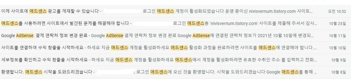처음 이 블로그에 어느 정도 글을 개제한 이후 10월경 문득 구글 애드센스 심사 신청을 넣었는데, 한동안 너무 바빠서 그 결과가 어떤지 살피지 못한 채로 시간이 흘렀다. 메일 이력을 찾아보니 최초 제출부터 피드백까지는 2주가 소요됐고, 재정비 및 재심사 요청으로부터 광고 개제 허가까지는 사흘 정도 걸린 것 같다. 계정 세팅했을 때를 기준으로는 거의 한 달 반 정도 걸렸다.