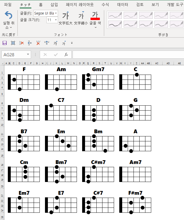 또 다른 방식으로는 이 블로그에 포스팅하는 것처럼 사용되는 코드표, 가사, 코드를 정리해두는 것이 있다. 내 경우 엑셀로 코드표를 작성하는데, 작성하면 작성할 수록 이미 만든 코드표를 붙여넣으면 되어서 작성에 소요되는 시간이 점차 단축되고 있다. 여러 방식으로 코드에 노출되면 눈에도 익고 귀에도 익으니 조금 더 오래 기억에 남아 만족스럽다.