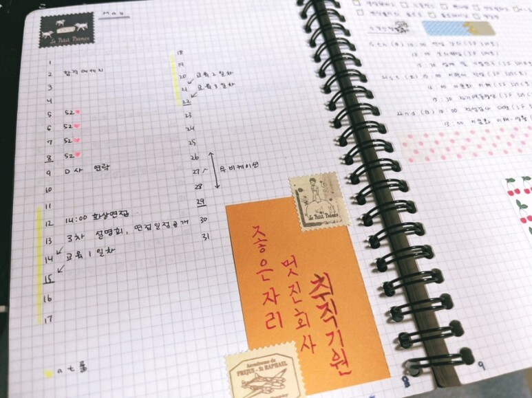 먼슬리에는 그 달의 주요 일정을 적었다. 이 때는 최대한 필요한 정보만 적으려고 노력했다. 내용이 많으면 한 눈에 안 들어와서 피로함을 쉽게 느꼈기 때문이다. 취업 관련 세미나 중 우수 수강생 일부를 선발해 교육하는 커리큘럼이 있었는데 이 때 선발을 축하하며 친구가 붙여준 부적(ㅋㅋㅋㅋ)이 눈에 띈다.