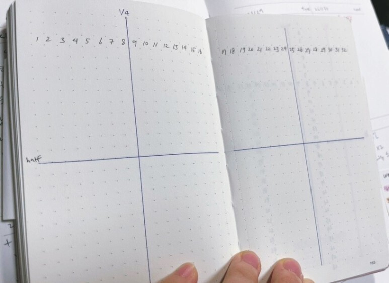 그리드 시트 옆에는 분기별/월별/주별/일별 목표나 점검일을 적어뒀다. 자주 펼쳐볼 페이지에 자주 눈에 들어오면 그만큼 더 목표를 의식하고 꾸준히 기록하게 되는 효과가 생길 것이라 믿었다.