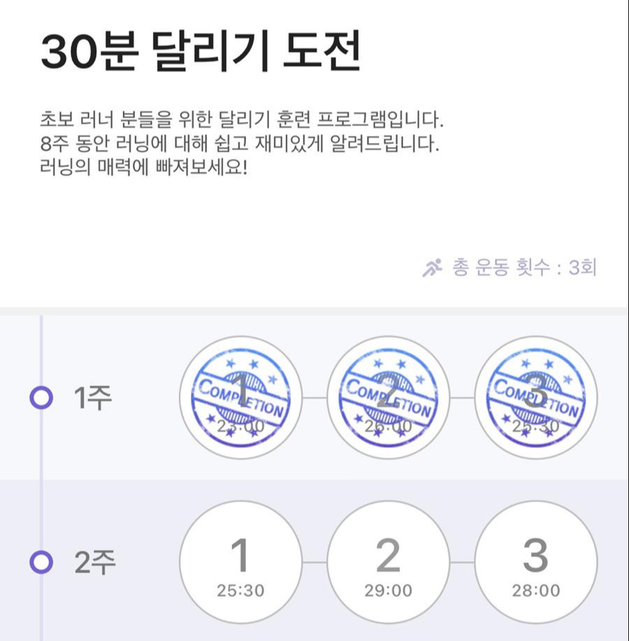 - 1주 2회차 러닝을 끝마쳤을 때 가진 휴식기 동안 약한 근육통 있음